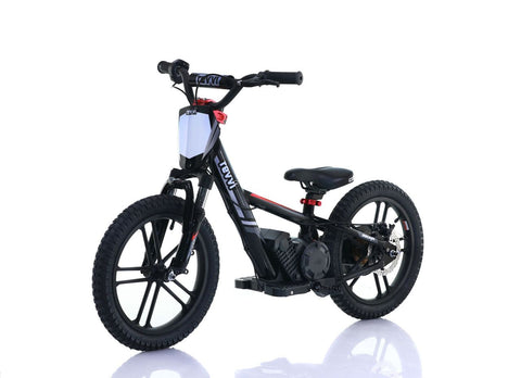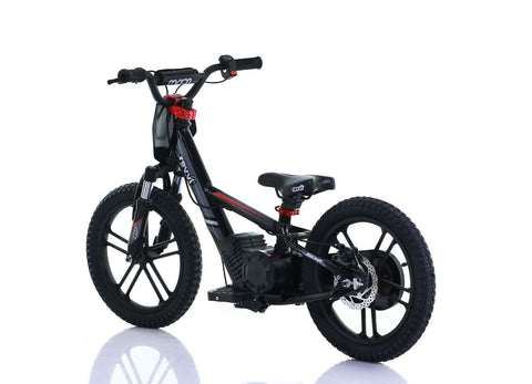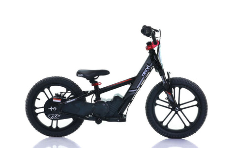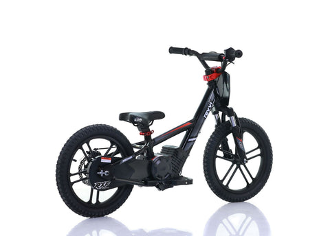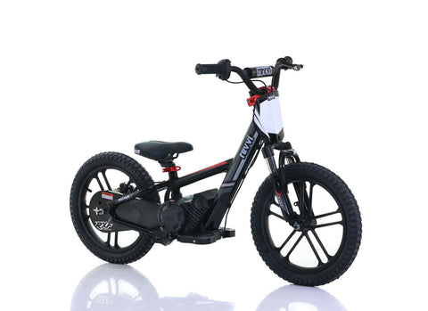 A super light electric-powered motor bike that has been specifically designed for kids, Weighing in at only 11kg's. The bike can be used as a conventional balance bike when learning to balance with its specially designed free wheel system. Then watch the rider improve and progress onto the slow speed setting (8mph) balancing on their own using the foot pegs. Perfecting their throttle control at the same time using the bikes twist throttle. Once they are confident using the slow speed setting they can then progress to the medium speed (10mph) and fast speed setting (12mph). Features hybrid rubber air filled tyres suitable for various ground types & a chain-driven motor that delivers reliable performance. The 16" Plus features the following upgrades over the standard 16" model - Front suspension, Metal wheels, rear disc brake, handlebar pad, full grip throttle, 3 speed settings, anodized handlebar, anodized seat clamp and a brushless 250w motor.